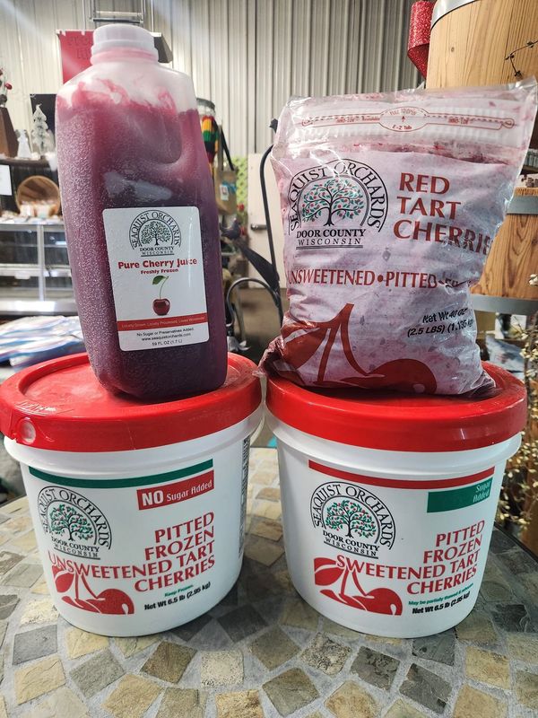 Seaquist Orchard frozen cherry juice, 2.5 lbs red tart cherries and 6lb bucket of sweetened & unsweetened cherries available in the store